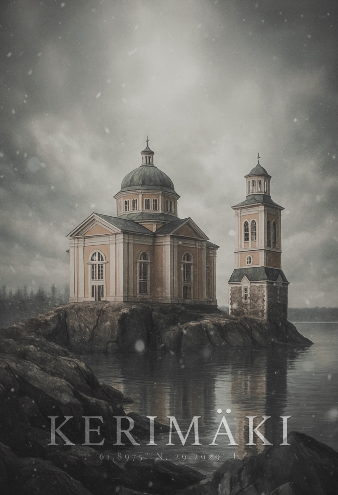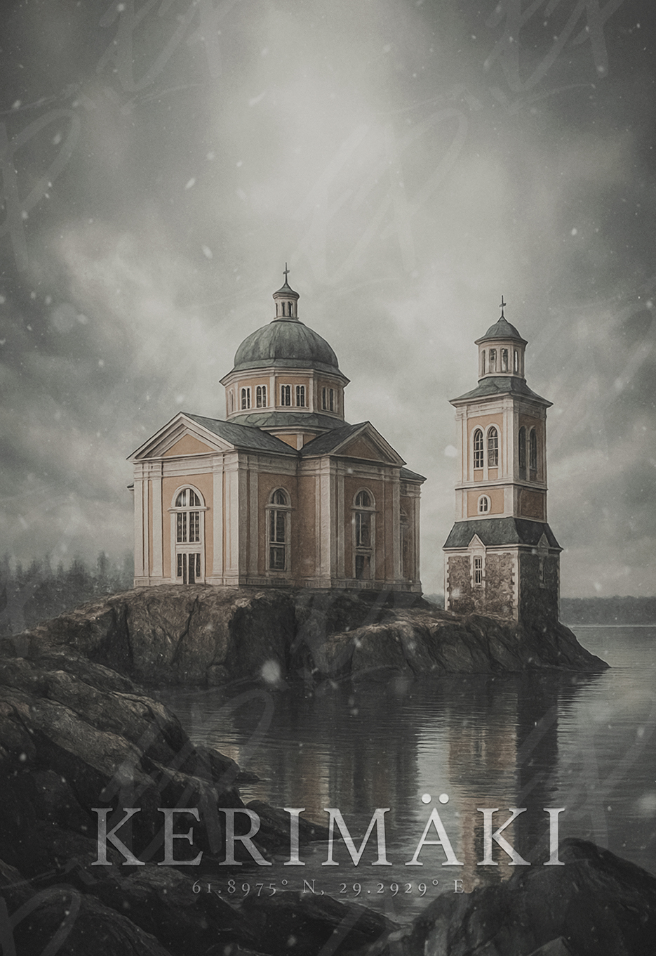 Elokuvamainen, dramaattinen taideteos, joka tulkitsee Kerimäen ikonisen kirkon ja sen ympäristön ainutlaatuisella tavalla. Saatavilla vain EdittiPajasta – jokainen juliste on uniikki osa kokoelmaa.