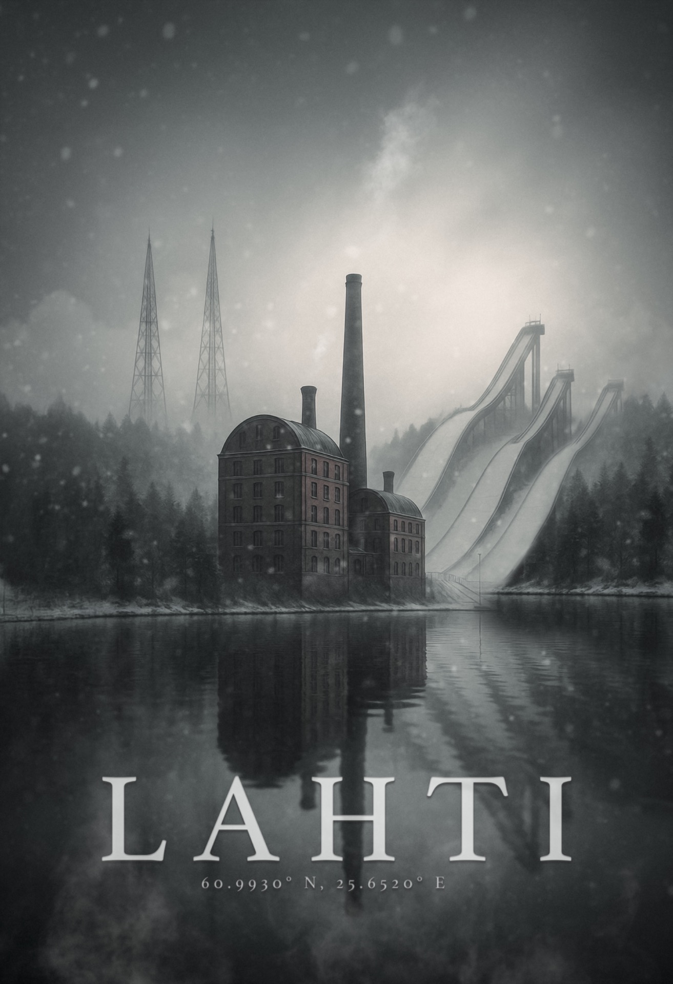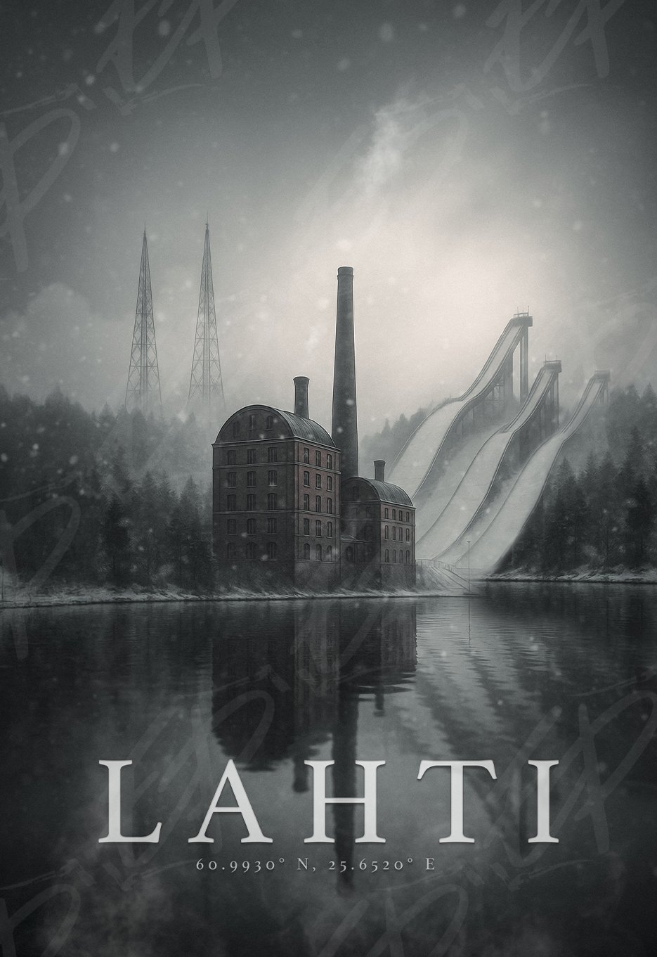 Elokuvamainen, dramaattinen taideteos, joka tulkitsee Lahden ikoniset maamerkit – kuten hyppyrimäet – ja kaupungin tarinan ainutlaatuisella tavalla. Saatavilla vain EdittiPajasta – jokainen juliste on uniikki osa kokoelmaa.