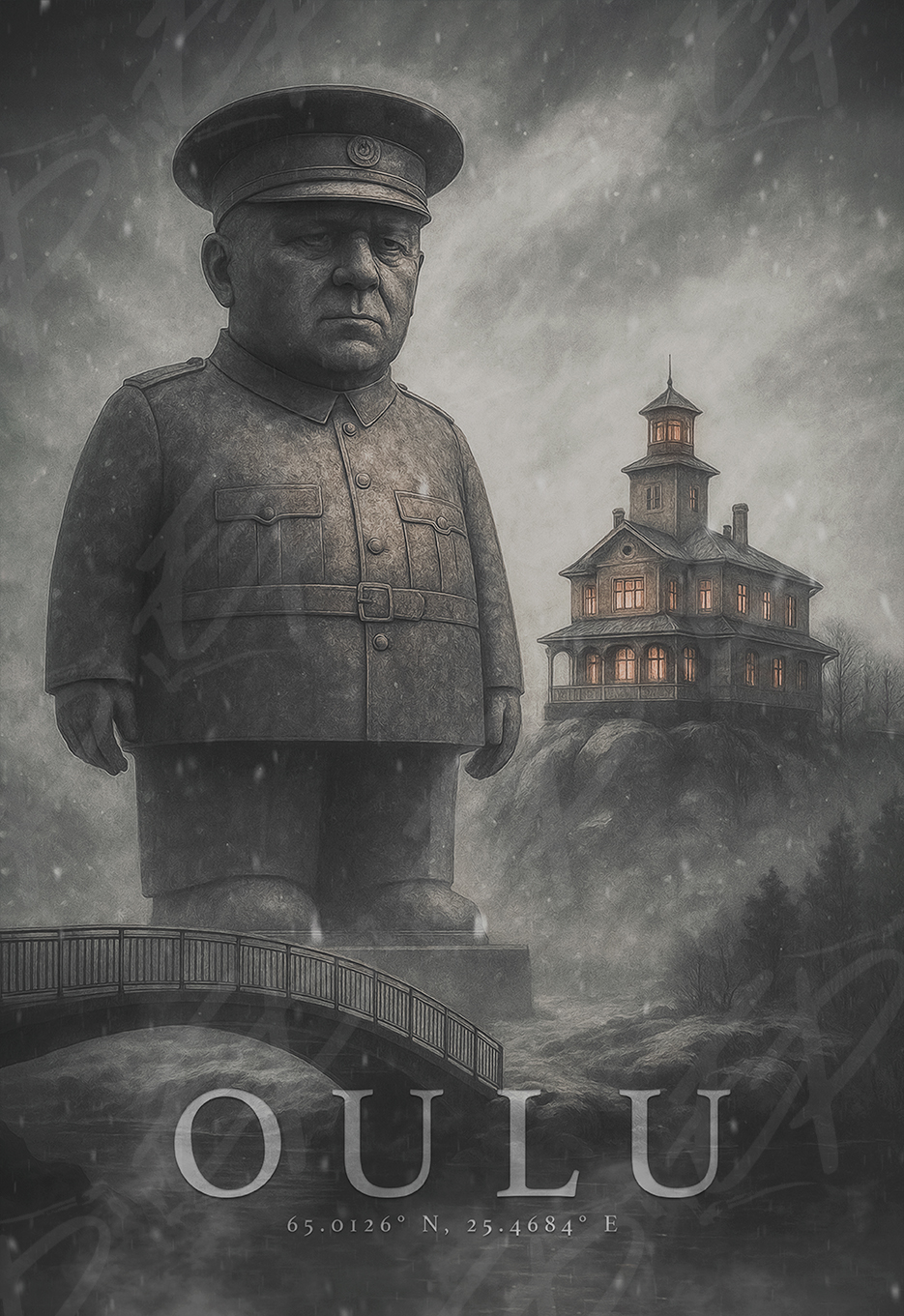 Elokuvamainen, dramaattinen taideteos, joka tulkitsee Oulun ikoniset maamerkit – kuten Toripolliisin patsaan – ja kaupungin tarinan ainutlaatuisella tavalla. Saatavilla vain EdittiPajasta – jokainen juliste on uniikki osa kokoelmaa.
