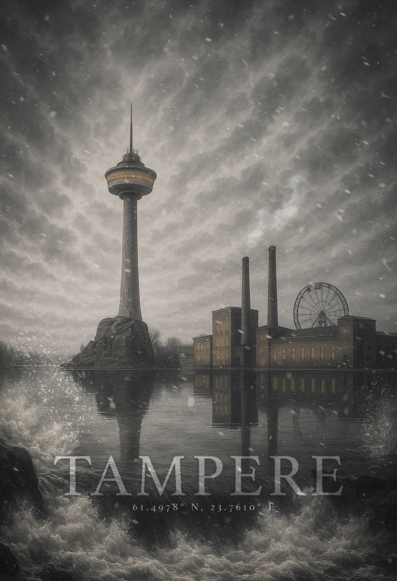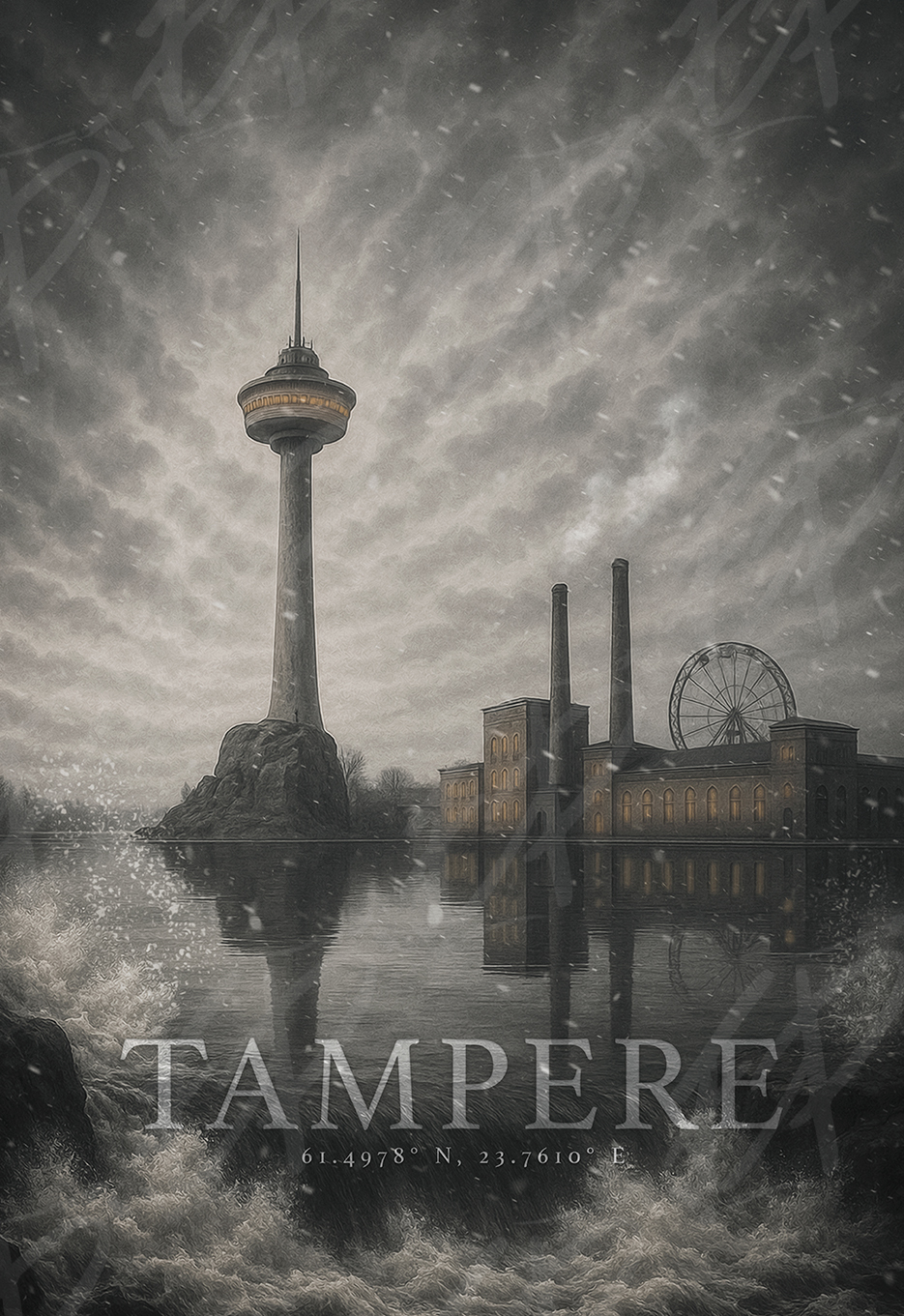 Elokuvamainen, dramaattinen taideteos, joka tulkitsee Tampereen ikoniset maamerkit – kuten Näsinneulan ja koskimaisemat – ainutlaatuisella tavalla. Saatavilla vain EdittiPajasta – jokainen juliste on uniikki osa kokoelmaa.
